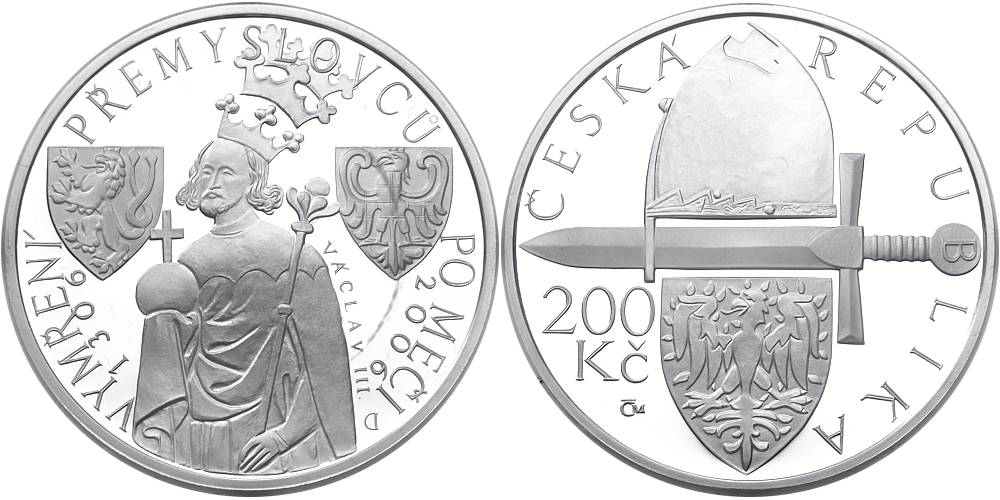 Dne 26. července vydává Česká národní banka do oběhu pamětní stříbrnou dvousetkorunu k 700. výročí vymření Přemyslovců po meči. Dvousetkoruna je ražena ze slitiny obsahující 900 dílů stříbra a 100 dílů mědi a vydává se ve dvojím provedení, v běžném a špičkovém (proof), které se liší povrchovou úpravou a provedením hrany. U mincí špičkové kvality je pole mince vysoce leštěné a reliéf je matován, hrana je hladká s vlysem "ČESKÁ NÁRODNÍ BANKA * Ag 0.900 * 13 g *". Mince běžné kvality mají hranu vroubkovanou. Průměr mince je 31 mm, hmotnost 13 g a síla je 2,3 mm. Obdobně jako u každé ražby mincí jsou i u těchto mincí povoleny odchylky v průměru 0,1 mm a v síle 0,15 mm. V hmotnosti je povolena odchylka nahoru 0,26 g a v obsahu stříbra odchylka nahoru 1 %.