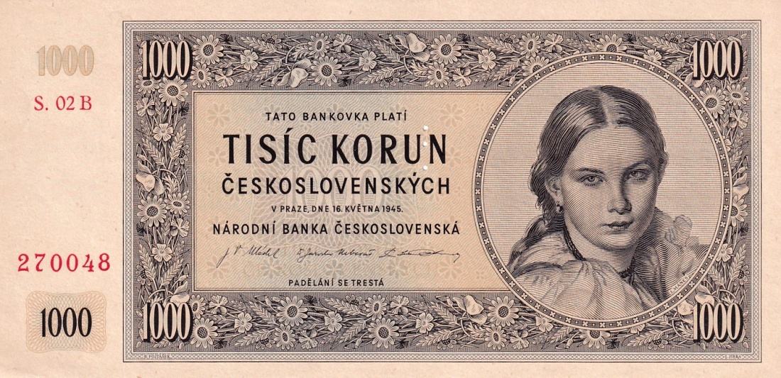 1000 Koruna 16.5.1945 série 02B, Aure.83b, perforace 3md, stav N