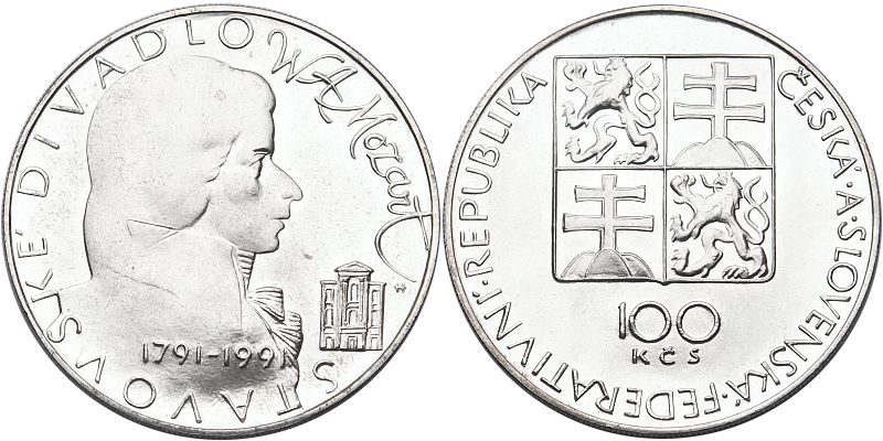 - Československo 1953 - 1993, 100 Kčs 1991, znovu otevření stavovského divadla v Praze při příležitosti 200. výročí umrtí W.A. Mozarta