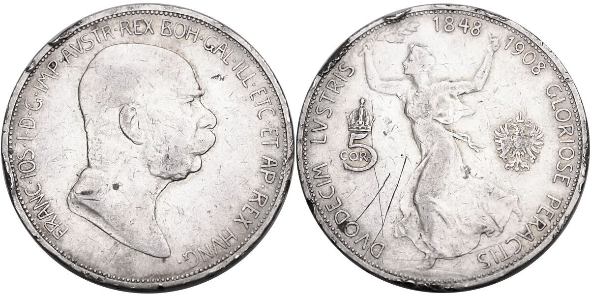 5 Koruna 1908 výroční, Früh.2185, Ves.128