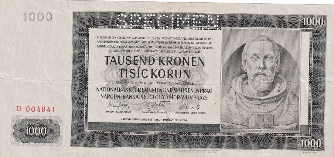Protektorát 1939 - 1945, 1000 Korun 1942, I. vydání serie D, SPECIMEN