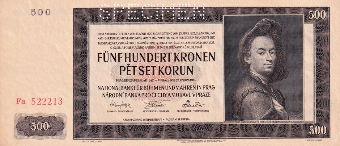 Protektorát 1939 - 1945, 500 Korun 1942, SPECIMENSkladem 1 ks700 Kč/ ks