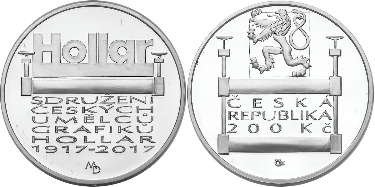 - Česká republika, 200 Kč 2017 proof 100. výročí založení Sdružení českých umělců grafiků Hollar, certifikát podepsaný autorem
