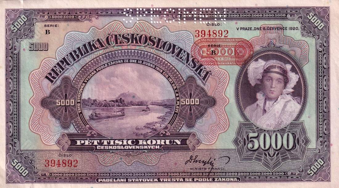 Československo 1919 - 1939, 5000 Korun 6.7.1920 SPECIMEN přetisk 1943