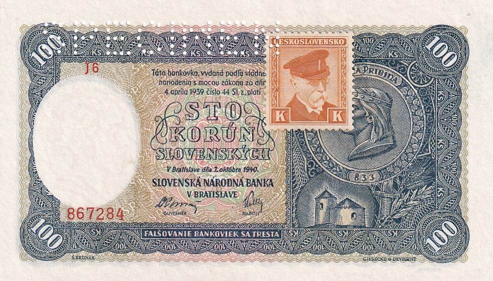 100 Korun 7.10.1940 kolkovaná, I. vydání, série J6, perforace SPECIMEN, Aure.67a1, stav N