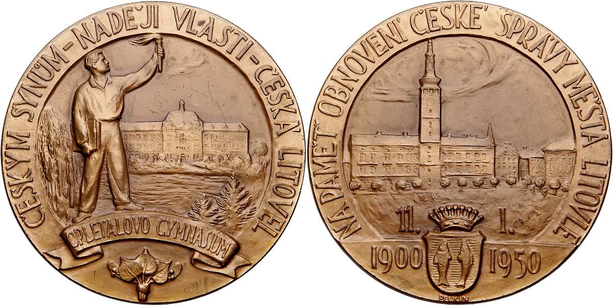 Medaile na paměť obnovení české správy města Litovel 1900-1950, bronz, 60mm, 81.09g