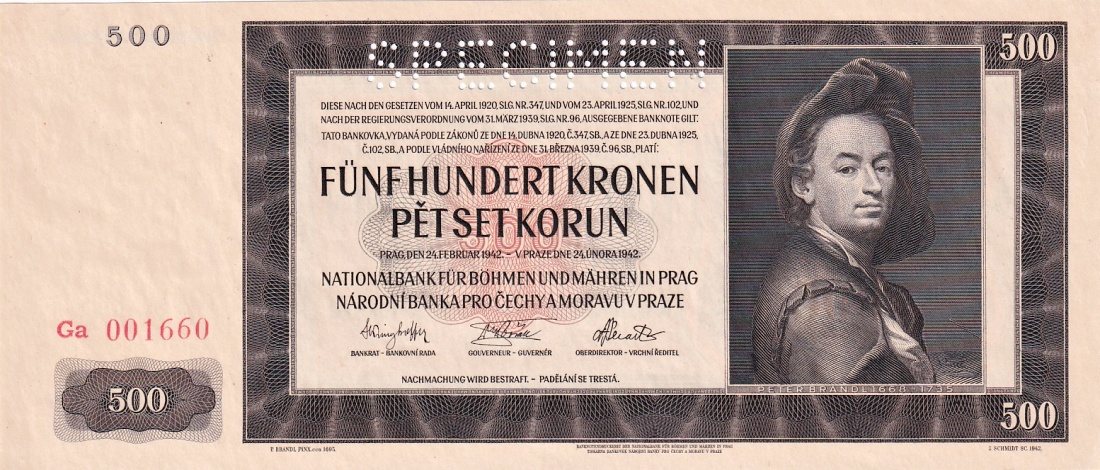 500 Korun 24.2.1942, II. vydání série Ga, perforace SPECIMEN, Aure.38a stav N