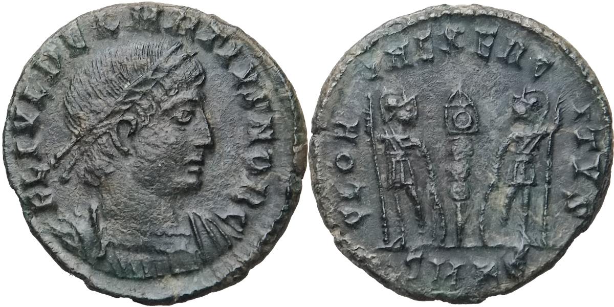 AE 3/4, dva vojáci s kopím mezi nimi jedno polní znamení, 1.35g, Sear.3832, R!