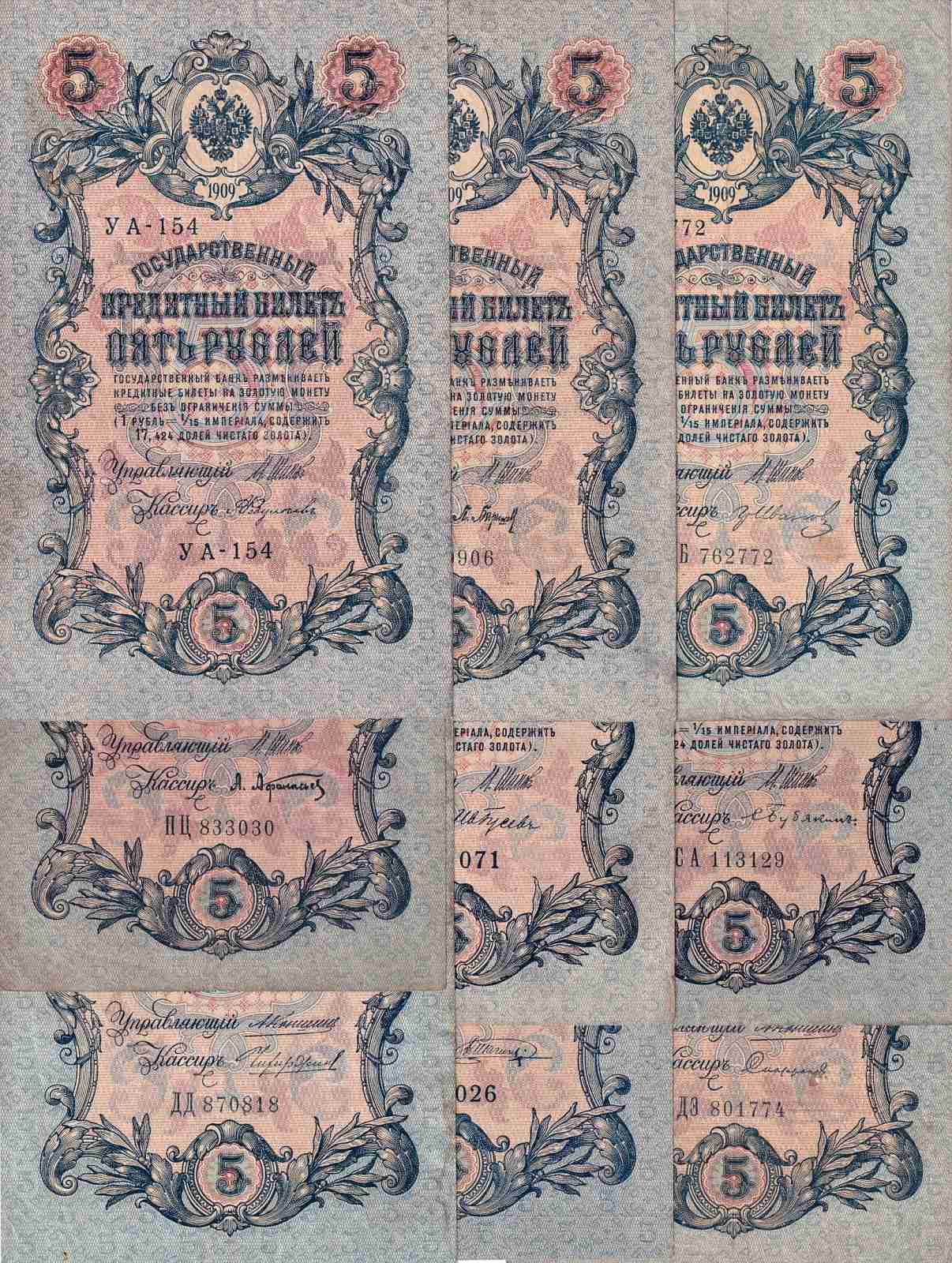 Rusko, konvolut bankovek 5 Rublů 1909, 9ks každá s jinou signaturouSkladem 1 ks290 Kč/ ks