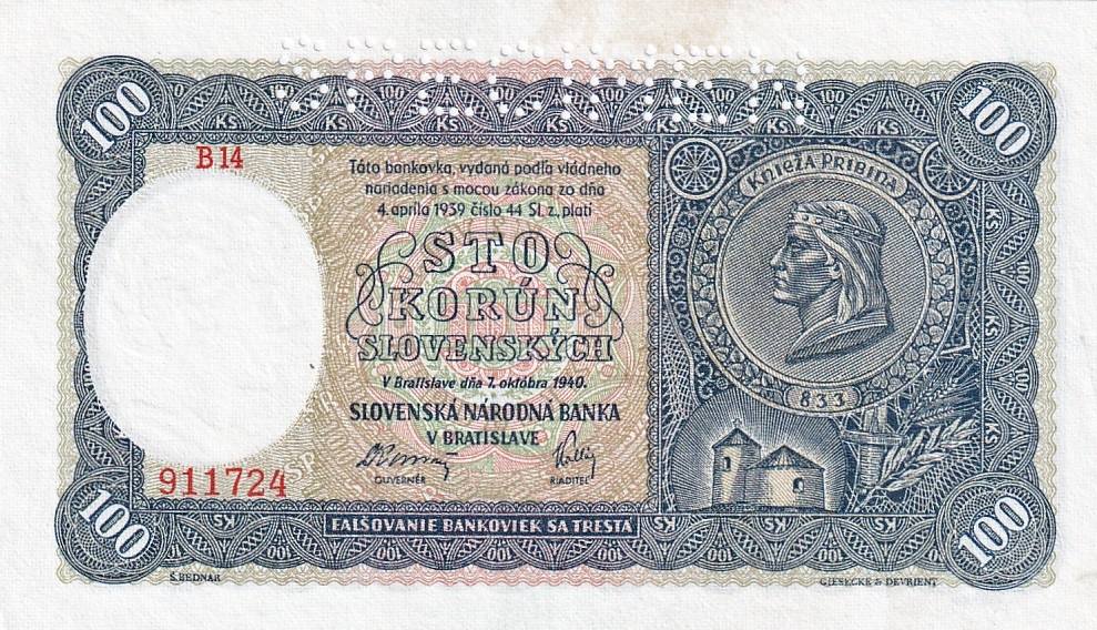 Slovenská republika 1939 - 1945, 100 Korun 1940, SPECIMENSkladem 1 ks770 Kč/ ks