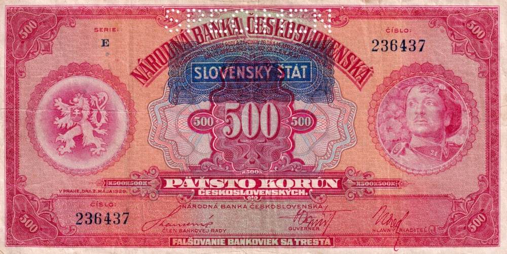 Slovenská republika 1939 - 1945, 500 Korun přetisk b.l.(1939), SPECIMEN